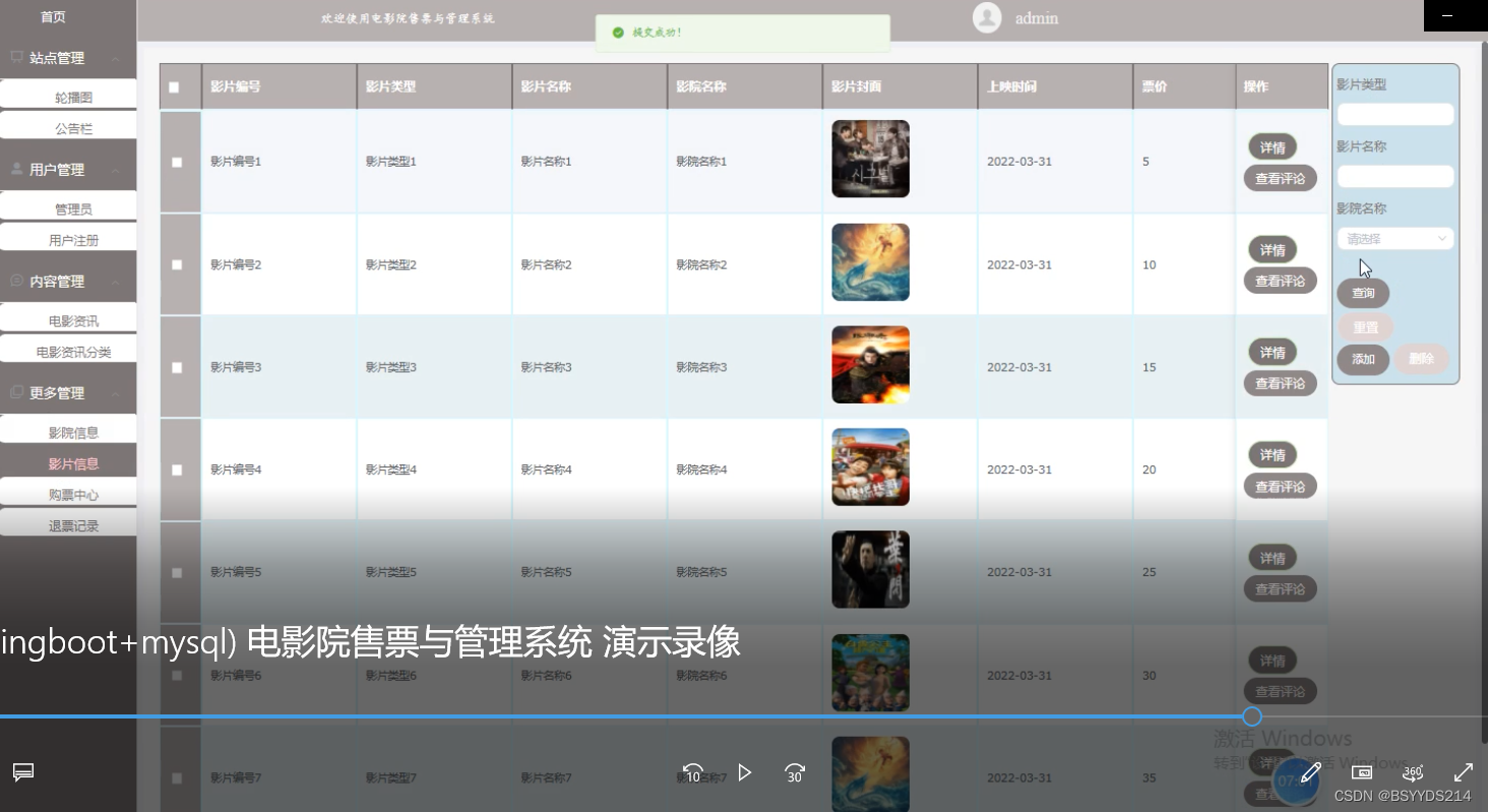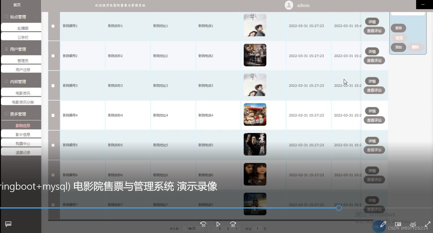 影片信息管理:对影片信息进行维护,添加、删除、修改信息。