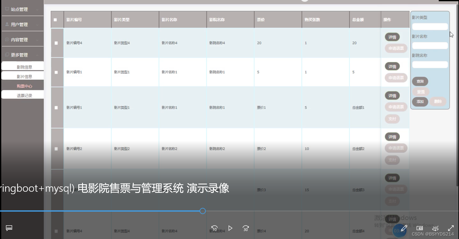 退票记录:存放给退票记录的内容,包括影片编号、影片类型、票价、购买张数、总金额、退款原因、退款时间、退款金额、用户账号、审核状态、审核回复等数据项。