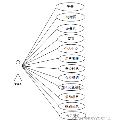 web后台管理上的管理员是维护整个公益慈善管理系统中所有数据信息的。管理员角色用例如图2-5所示。