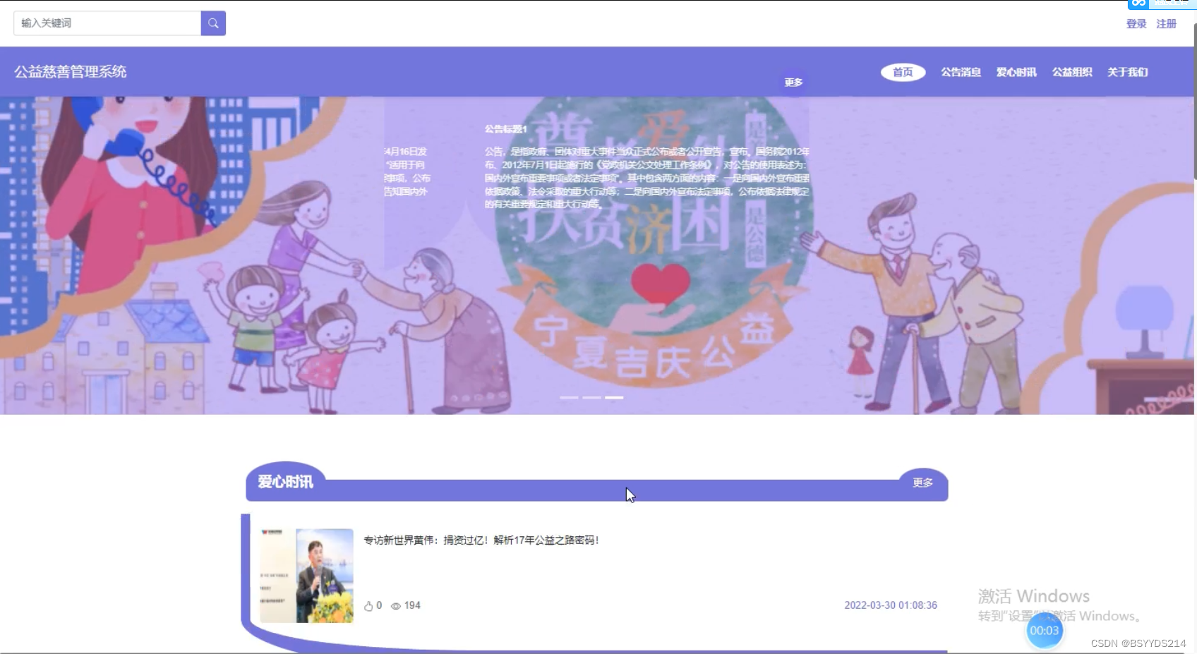 当进入公益慈善管理系统的时候,首先映入眼帘的是系统的导航栏,下面是轮播图以及系统内容,其主界面展示如下图4-1所示。
