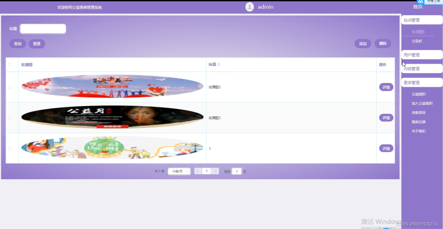 (5)站点内容管理:管理员可以对公益慈善管理系统中首页显示的轮播图以及系统中的一些公告发布到系统当中,让用户及时的查看到系统信息,进行合理安排。