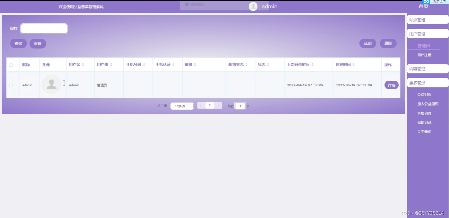 公益慈善管理系统中的管理人员是可以对前台注册的普通用户进行管理的,也可以对管理员进行管控。界面如下图4-6所示。