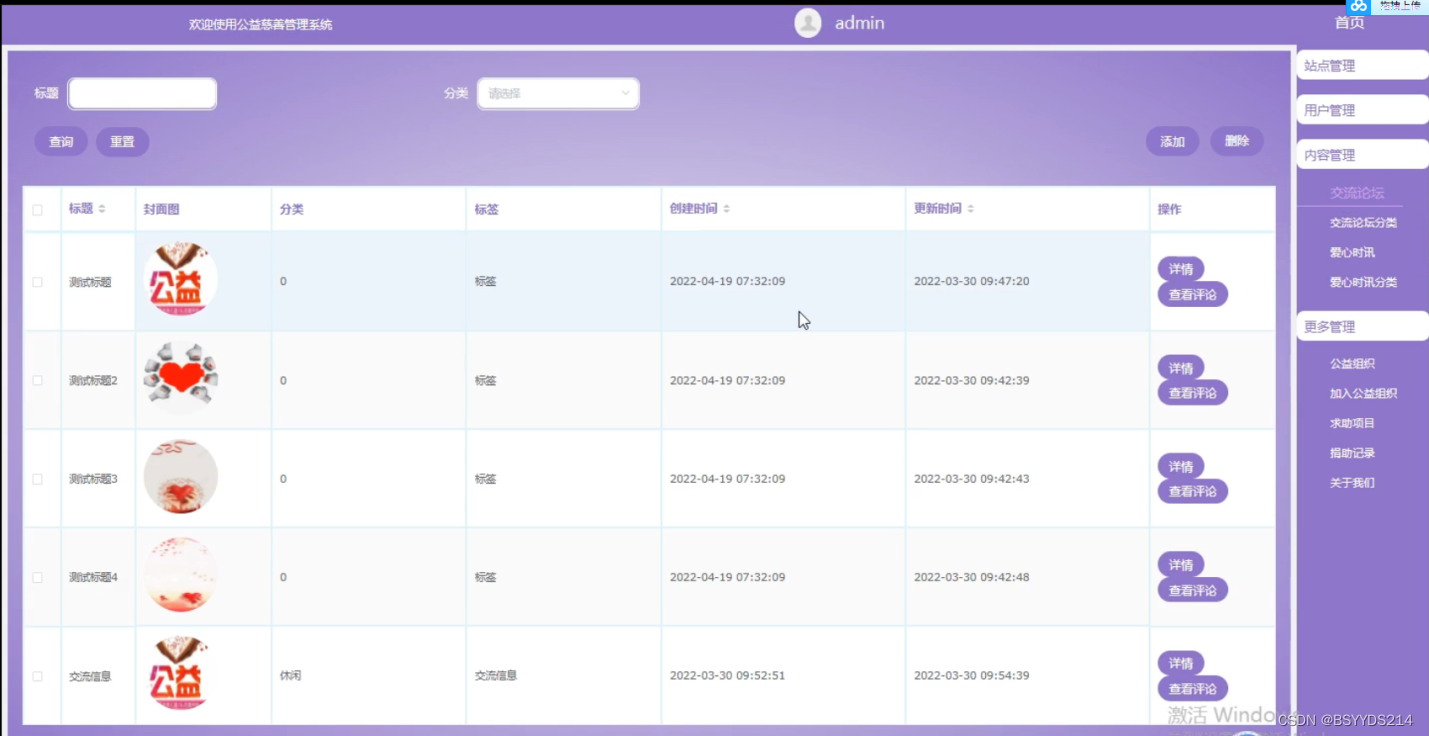 (2)交流论坛管理:管理员在后台可以对公益慈善管理系统中显示的论坛信息进行增删改查。