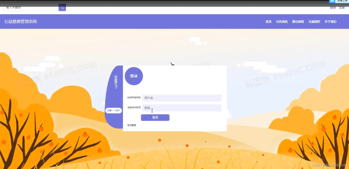 公益慈善管理系统中的前台上注册后的用户是可以通过自己的账户名和密码进行登录的,当用户输入完整的自己的账户名和密码信息并点击“登录”按钮后,将会首先验证输入的有没有空数据,再次验证输入的账户名+密码和数据库中当前保存的用户信息是否一致,只有在一致后将会登录成功并自动跳转到公益慈善管理系统的首页中;否则将会提示相应错误信息,用户登录界面如下图4-2所示。