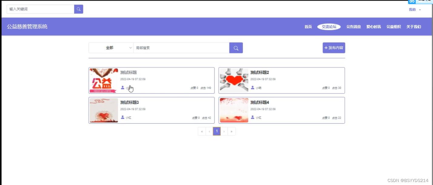 (3)内容管理:管理员可以对公益慈善管理系统前台展示的交流论坛、交流论坛分类、爱心时讯以及爱心时讯的分类进行管控。