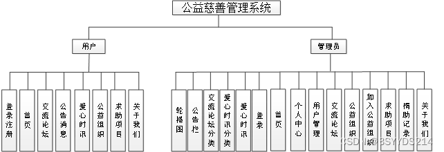 按照公益慈善管理系统的角色,我划分为了注册用户管理模块和管理员管理模块这两大部分。