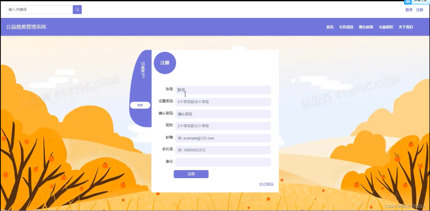 不是公益慈善管理系统中正式会员的是可以在线进行注册的,如果你没有本公益慈善管理系统的账号的话,添加“注册”,当填写上自己的账号+密码+确认密码+昵称+邮箱+手机号等后再点击“注册”按钮后将会先验证输入的有没有空数据,再次验证密码和确认密码是否是一样的,最后验证输入的账户名和数据库表中已经注册的账户名是否重复,只有都验证没问题后即可会员注册成功。其用会员注册界面展示如下图4-3所示。