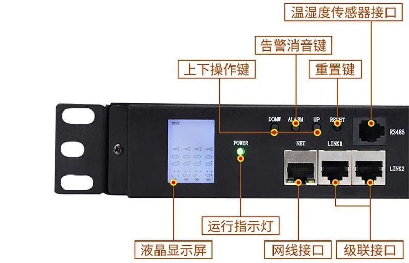 同为(TOWE)远程智能PDU物理外观:物理外观:黑色铝合金外壳,典雅大气,配备集成数值LCD显示屏,可根据按钮来切换信息显示状态;内置一体化铜带,360°绝缘层,安全阻燃。PDU(SNMP/RS485协议)表头模块嵌入ARM内核处理器及专用电量计量芯片,可实现对PDU用电设备的高精度电量计算,通过LCD屏幕显示各类电量及环境测量参数,实现电量监测及能耗管理。同为(TOWE)远程智能PDU电源支持多样化的接口类型,提供网络通讯接口、级联接口和传感器接口,可接入温湿度传感器,DI输入,可接入各类开关电平状态传感器。通过烟感、水浸、温湿度传感器实现对IDC机房的周围环境监测;通过门磁,对机柜门实施开关进出管理。