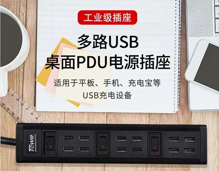 同为科技TOWE推出USB分控桌面PDU插座,设计时尚,功能强大,提供智能快充、过载保护和电池电压均衡,适用于家庭、公共场所和办公环境,解决多设备充电问题,提高生活和工作的便捷性与安全性。