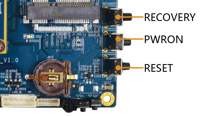 长按recovrey按键并保持,后给板子上电或者按复位。