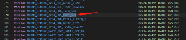 在“imx8mm-pinfunc.h”中可以找到“PWM1_OUT”的相关的宏定义,可以搜索到三条,找到“I2C4_SDA”引脚的此条定义: