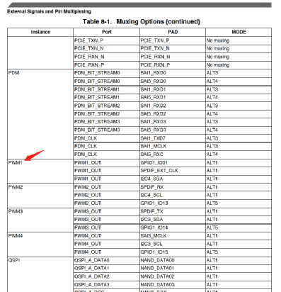 比如,需要使用PWM1,在《IMX8MMRM.pdf》芯片参考手册(以下简称芯片手册)第八章,IO复用表,找到PWM1: