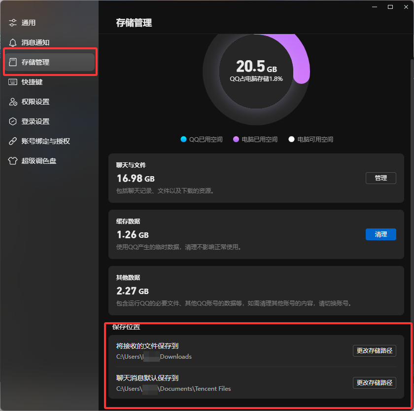 如果C盘比较小的话,那最好这些软件的「保存路径」改一下,不然之后照样会满。然后又要清理~