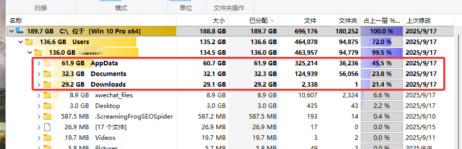 一般来讲AppData文件夹里面的数据量会非常的多(因为多数软件的数据都会堆在这个位置),这个时候你就要评估下,哪些是可以删的,哪些是不能删的。