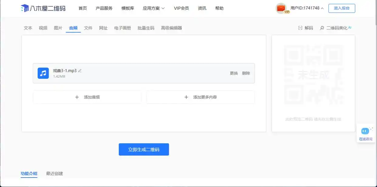 等音频上传好了,页面上会有个预览的地方,你可以先听一下音频,确认是不是你要的那个。要是没问题,就可以点击生成二维码的按钮了。这时候,八木屋二维码生成器就开始工作啦,很快就能给你生成一个专属的戏剧音频二维码。