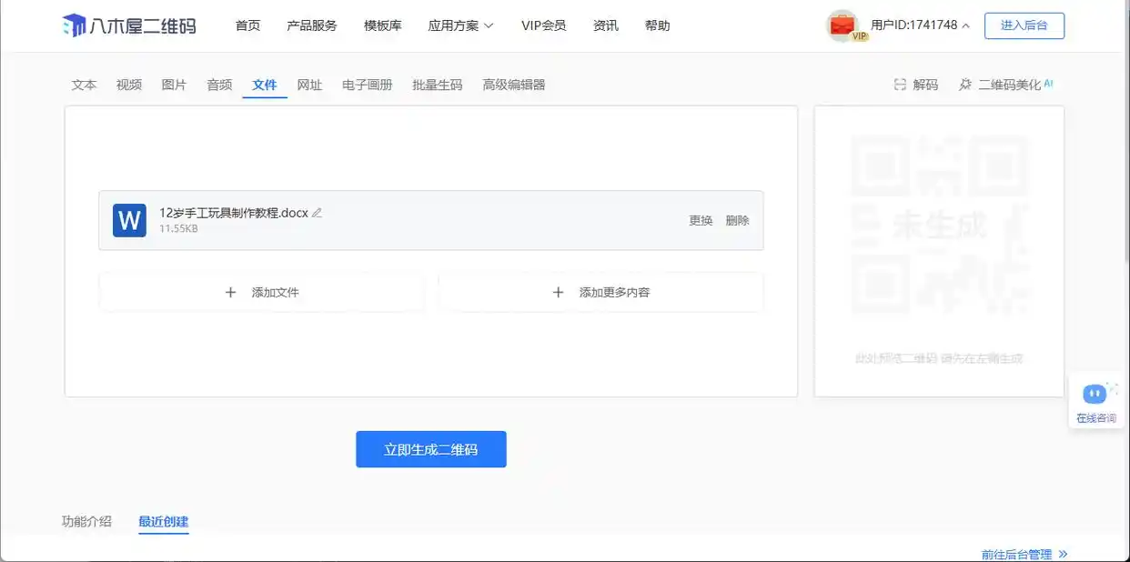 接下来我给大家说说用八木屋二维码生成器把手工制品文件制作成二维码的步骤。