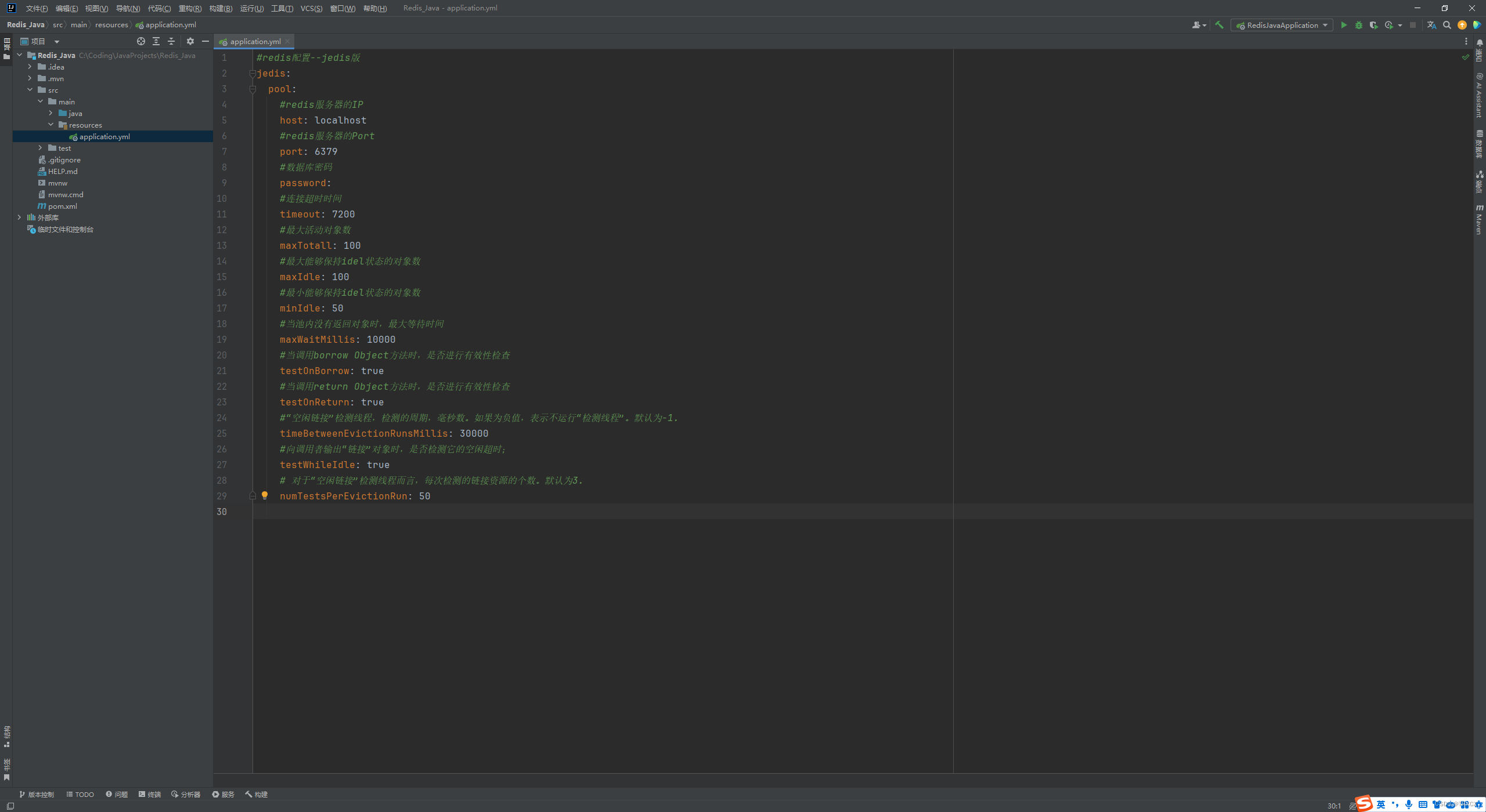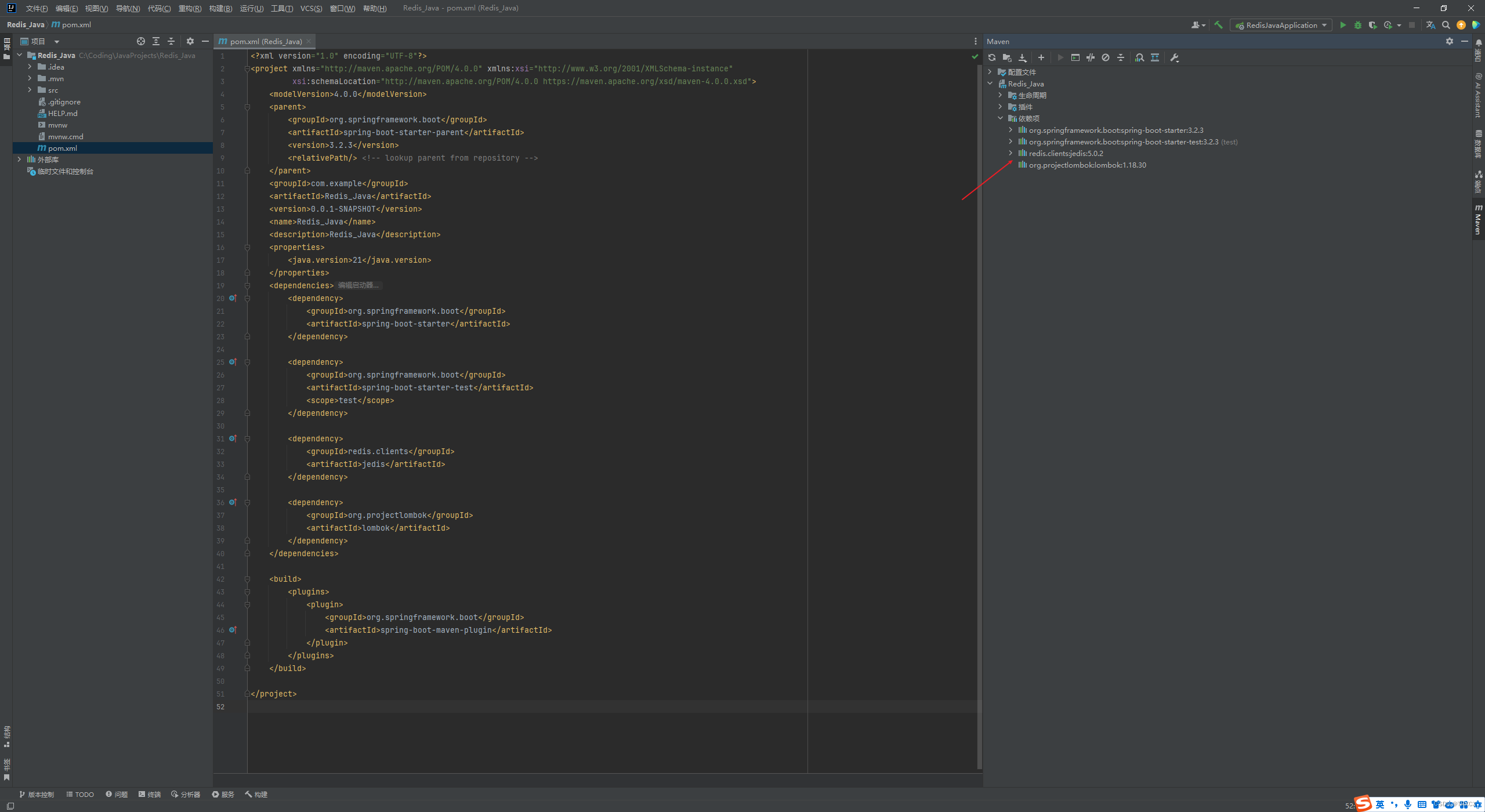 其中,jedis是所需要的依赖,lombok是为了方便后续配置
