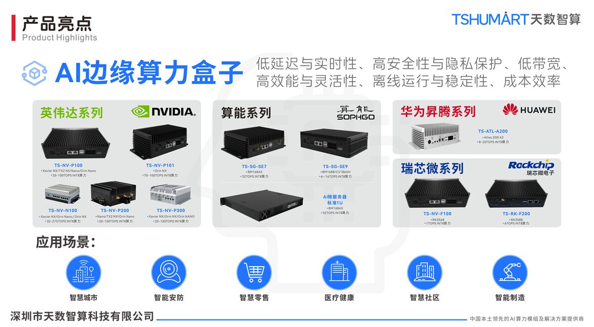 深圳市天数智算科技有限公司(简称:天数智算)是中国本土领先的AI算力模组及解决方案提供商,公司与Qualcomm、NVIDIA、RK等全球主流AI算力芯片战略合作,提供1-500TOPS算力硬件解决方案。广泛应用于庭院机器人、低速物流及环卫无人车、无人电动叉车、AI HOME、特种车辆ADAS、AI BOX等领域,产品市场覆盖国内、日本、中东、东南亚等区域。核心团队来源于华为等,管理团队履历完整,有全球视野,有上市企业管理等经验,能深刻洞察市场及客户需求,致力为全球合作伙伴提供端到端AI行业解决方案。
