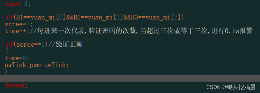 我们可以在按键四里面设置标志位time,每次进来都+1,但当密码正确就置0(连续已被打断)