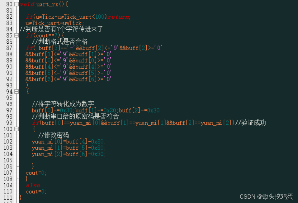 我们可以先进行判断字符是否进来7个,如果没有再将cout置0-重新接收,如果进来7个,我们再判断格式是否正确,这里也有个小细节,由于通过串口发送的是字符,我们要先转换为数字才能再进行判断串口给的原密码是否正确,然后修改密码。