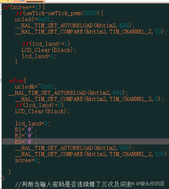 scree是判断密码是否正确密码的标志位,我们在判断正确后,开始保持输出页面5s,且设置2000hz的频率,和10的占空比(初始占空比大家随便设置,我一开始就设置的百分之50,但是最好不要设置百分之10),后面在回到初始界面(重新设置为初始值)