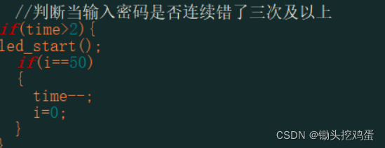 后面就可以进行密码错误次数片段,这里面有个小细节,由于输入错误就要闪烁五秒,然后我通过设置i来进行50次的100ms间隔,后面我是将time又减了一次,让程序下一次就执行不到这里,除非密码又输错,然后time的状态应该是3-2-3-2-3-2.......