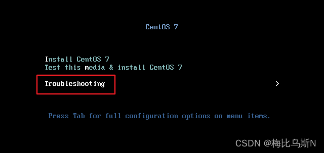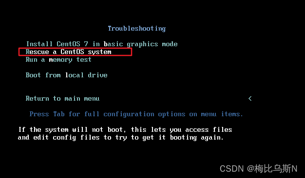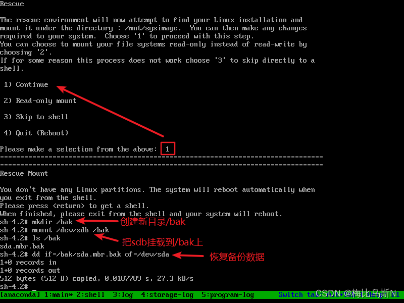 由于MBR扇区被破坏已经无法再从该硬盘启动系统,所以需要使用其他硬盘中的操作系统进行引导,或者直接使用centos7系统的安装光盘进行引导。目的都是获得一个可以执行命令的shell环境,以便从备份文件中恢复MBR扇区中的数据。破坏MBR扇区的数据之后重启,在虚拟机上会出现安装向导界面,进入“急救模式”。