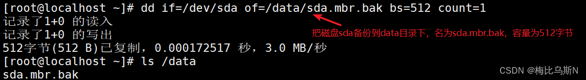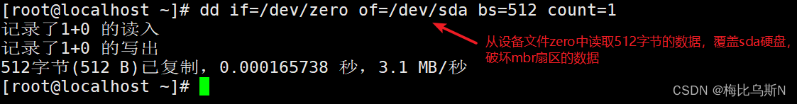 仍然使用dd命令,人为的将MBR扇区的记录覆盖,以便模拟出MBR扇区被破坏的故障情况。
