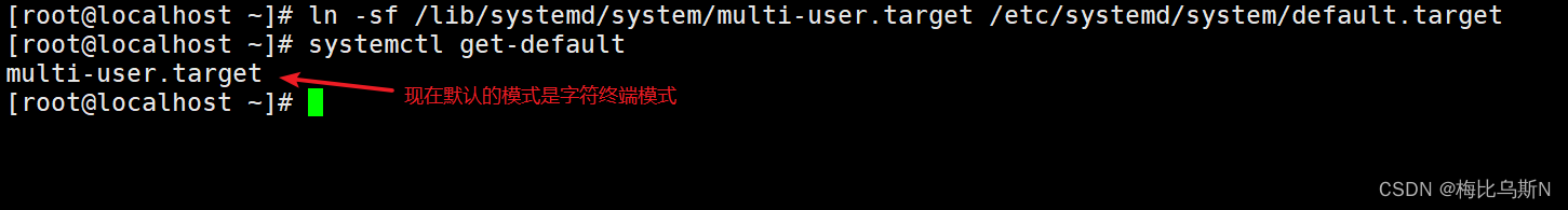 现在默认的状态时图形化界面,如果要想直接打开就是字符终端模式,就要做链接性文件。把/lib/systemd/system/multi.user.target 指定到 /etc/systemd/system/default.target。指定完成之后在检验是否指定到字符终端模式。