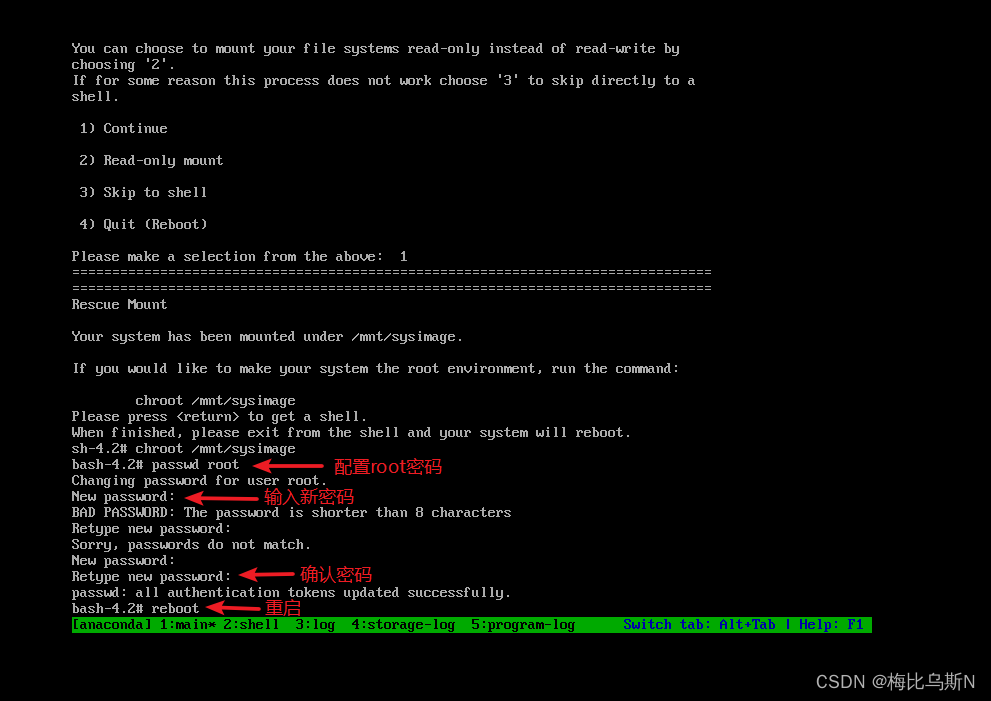 使用安装的光盘进入急救模式的shell环境,直接执行“passwd root” 命令重设root用户的密码。