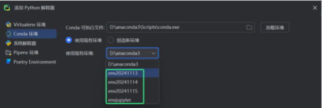 轻轻点一下右下角的解释器切换,在弹出的虚拟环境中随便切换,全部自动加载好了~