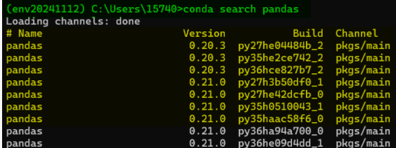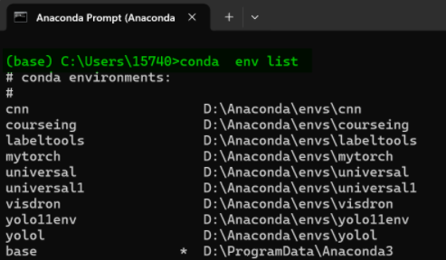 效果:展示了所有的环境名称及路径,其中base是默认环境