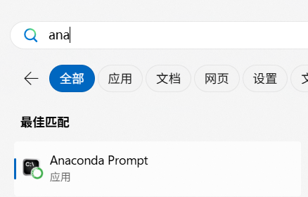 搜索,输入ana,在查询结果菜单中,点击 Anaconda Prompt。