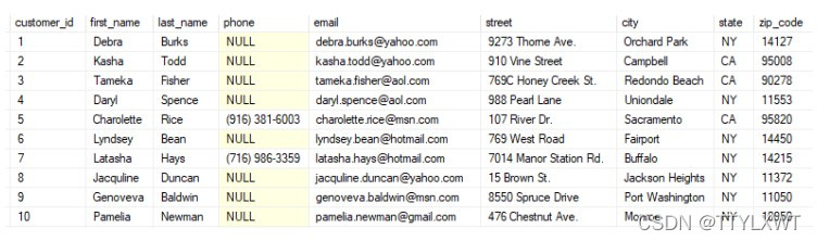 在表中,每行代表一个唯一记录,每列代表记录中的一个字段。 例如, customers 表包含客户数据,如 客户标识号,名字,姓氏,电话,电子邮件和地址信息,如下所示: