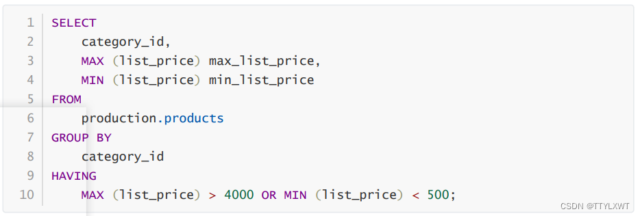 以下语句首先查找每个产品类别中的最大和最小价格。 然后,它筛选出最大价格大于 4000 或最小价格 小于 500 的类别: