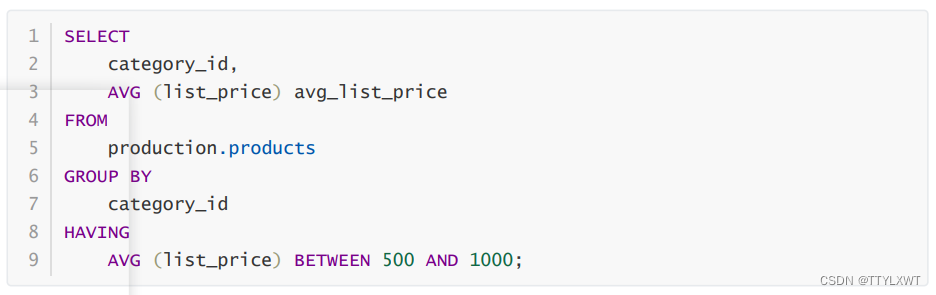 以下语句查找平均价格介于 500 和 1000 之间的产品类别:
