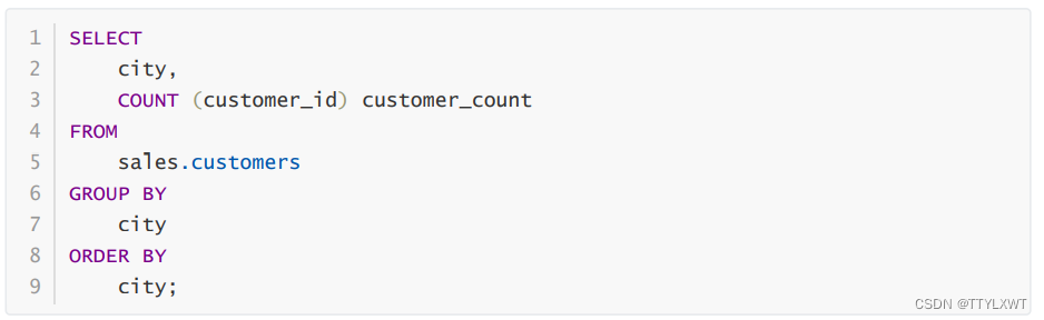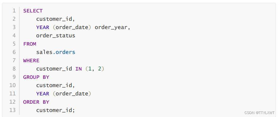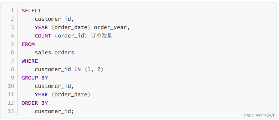 首先, GROUP BY 子句按客户和订单年份对销售订单进行分组。 COUNT() 函数返回每个客户每年 下达的订单数。