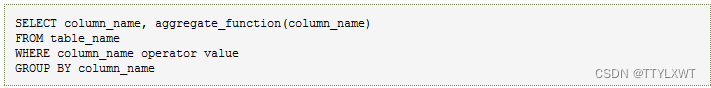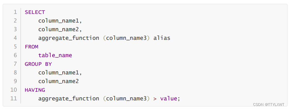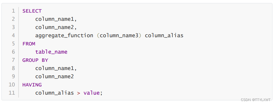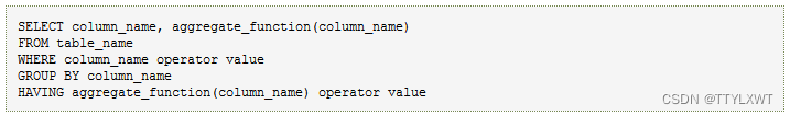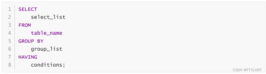 在此语法中, GROUP BY 子句将行汇总为分组, HAVING 子句将一个或多个条件应用于这些每个分组。 只有使条件评估为 TRUE 的组才会包含在结果中。换句话说,过滤掉条件评估为 FALSE 或 UNKNOWN 的 组。