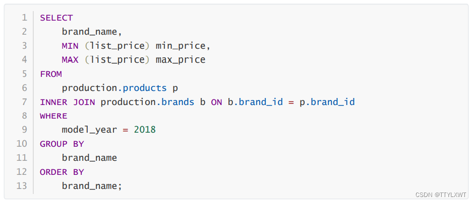 以下声明返回所有型号年份为 2018 的最低和最高价产品: