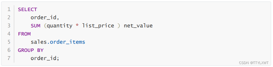 以下查询使用 SUM() 函数获取每个订单的总价值: