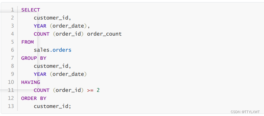 其次, HAVING 子句筛选出订单数至少为 2 的所有客户。
