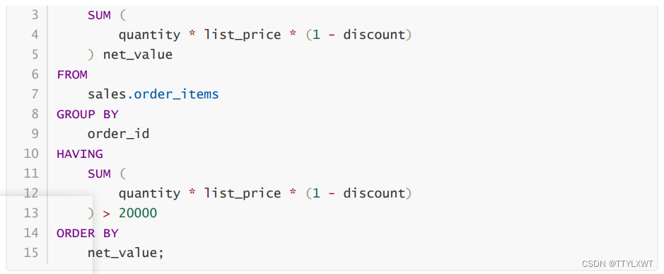 其次, HAVING 子句过滤净值小于或等于 20000 的销售订单。