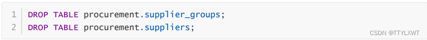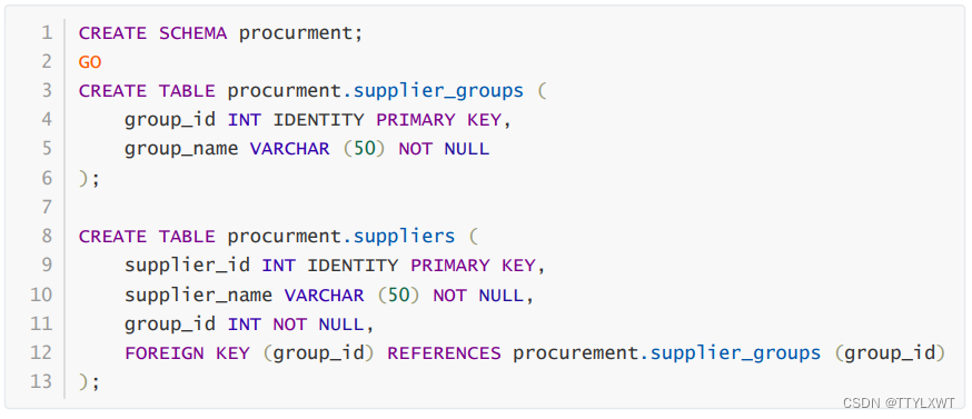 以下语句在 procurement 模式中创建两个新表: supplier_groups 和 supplier :