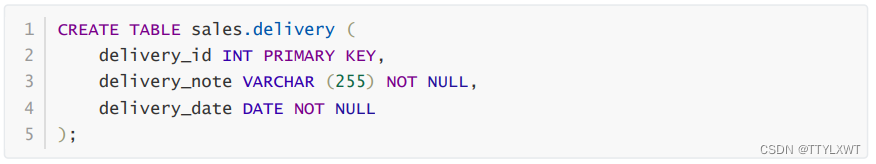 以下语句在 sales 模式中创建一个名为 delivery 的新表: