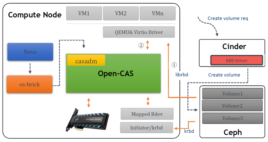 和主流的缓存软件一样,OpenCAS也支持多种缓存模式,包括Write Through,Write Around,Write Back,Write Only,Pass Through。将OpenCAS安装到Compute Node上,并设置为对远程Ceph映射过来的盘,如下图所示。