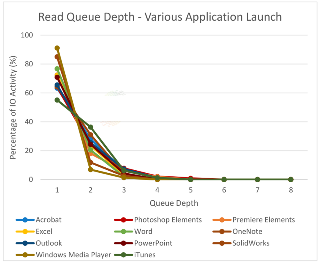 看看下面这张图,大多数桌面类应用无一例外全部都是交互式I/O模型,除了一些后台数据处理类业务比如音视频播放/处理、压缩解压、上传下载等等外。图中显示出,多数桌面类常用程序发出4个及以上数量的并发I/O的概率已经非常低。50%以上的概率都是发出单个同步I/O。