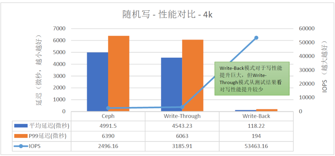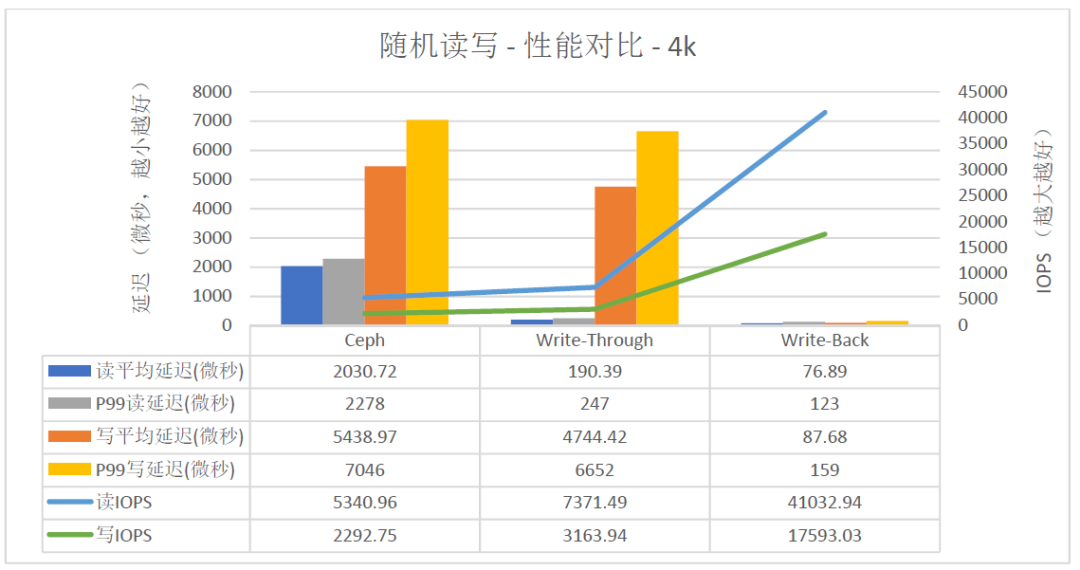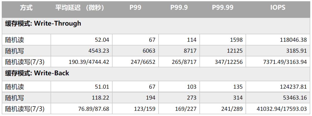 在随机读写 7/3 比例混合的场景中,Write-Through 模式写延迟仅有 12.7%减少(5438.97 VS 4744.42),但读性能表现良好,读请求的平均延迟缩小了约 90%(2030.72 VS 190.39),P99 缩小了 89%(2278 VS 247),有效抑制了读请求的延迟波动率。而Write-Back模式则表现出了卓越的性能优势,读延迟减少了 96.2%(2030.72 VS 76.89),写延迟减少了 98.3%(5438.97 VS 87.68),而每秒读写请求数提升了约 7.6 倍。