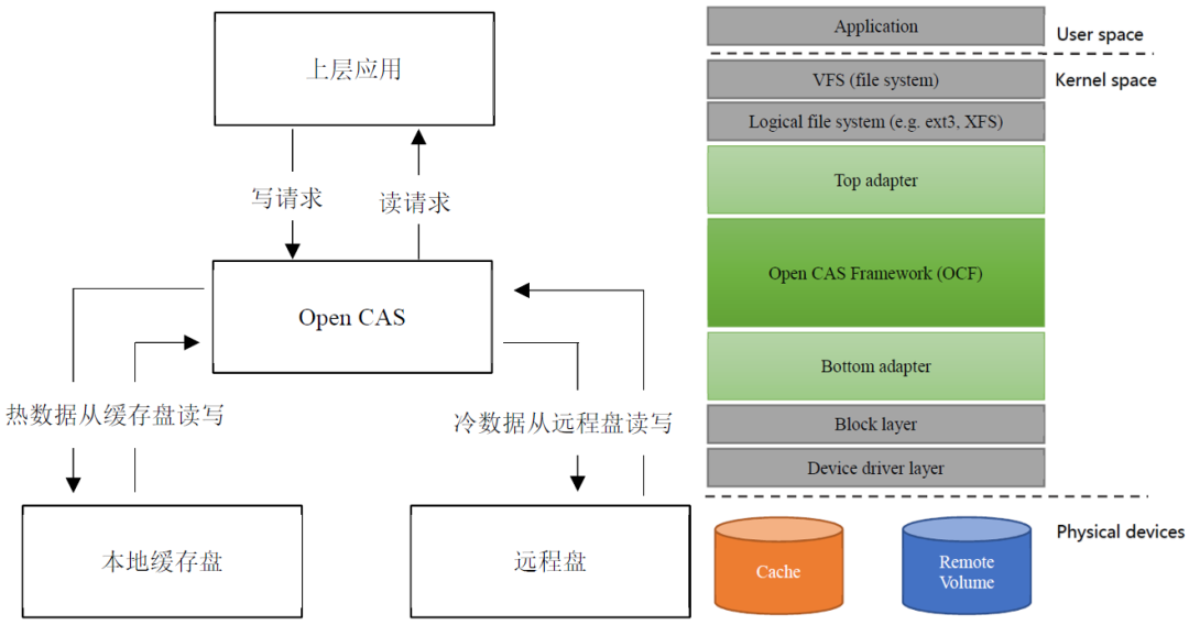 而如果将应用直接迁移到傲腾介质上,的确是最优的选择,但是鉴于傲腾的容量目前还达不到NAND Flash级别,所以将它用作缓存是一个非常具有性价比的方案,这就必须有一层软件来作为缓存管理层。好马配好鞍,Intel专门为傲腾开发了开源的缓存管理软件——OpenCAS。OpenCAS会在系统中虚拟出一个块设备,应用部署在该层的块设备之上,所有的I/O请求就会被OpenCAS接收并处理,利用高效的缓存算法,发挥出傲腾的性能。