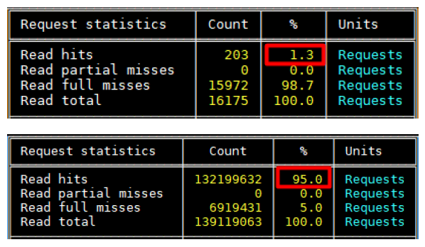 测试随机读取时,循环运行 FIO 测试工具 30 次。随着测试的进行,缓存的命中率也从开始几秒时的 1.3%左右逐步提升到最后的 95%-97%。这过程中性能表现也越来越好。这里数据采用 30 次运行里表现最好的数据。以下截图是 Open CAS 软件的缓存命中统计。