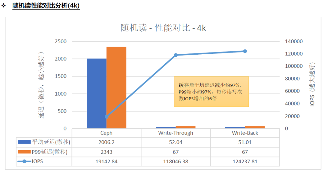 从以上的数据对比图可以看出,加了缓存之后,不管是 Write-Through 模式还是 Write-Back 模式,数据读取的延迟都有了非常大的改善。其中平均延迟从2006.2微秒减少到了 52.04 微秒(Write-Through)以及 51.01 微秒(Write-Back),降低了约40倍。P99 延迟数据从 2343 微秒减少到了 67 微秒(Write-Through 和 Write-Back 均是),缩小了约 97%,与此同时,每秒读请求数 IOPS 从 19142.84 提升到了 118046.38 ( Write-Through )以及 124237.81 (Write-Back),提升了约 6 倍。